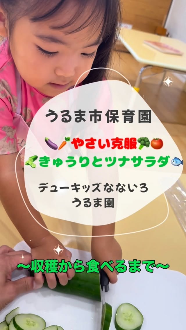 「今日は、デューキッズなないろうるま園のみんなで育てた“きゅうり”のお話です。 実は、野菜がちょっと苦手なお友だちがいました。 そこで、みんなで土を触って、苗を植えて、お水をあげて、毎日少しずつお世話を続けてきました。 少しずつ伸びていくつるに、子どもたちも興味津々。 『大きくなってきた!』『葉っぱが増えてる!』と、毎日成長を楽しみにしていました。 そしてついに、待ちに待った収穫の日。 みんなで力を合わせて育てたきゅうりは、とっても立派に育ちました。 そのきゅうりを使って、この日は “きゅうりとツナのサラダ” 作りに挑戦! きゅうりを洗ったり、ツナをボウルに入れたり、混ぜたり… 子どもたちはどの工程もとても楽しそうで、真剣な表情がとても印象的でした。 できあがったサラダは、ランチの時間にみんなでいただきました。 なんと、きゅうりが苦手だったお友だちも、 『おいしい!』『食べられたよ!』と嬉しそうにパクパク食べてくれました。 後日、ご家庭からも “お家でもきゅうりを食べてくれました!”という嬉しいご報告をいただきました。 自分で育て、触って、調理して、食べる。 そんな一連の体験が、子どもたちにとって大きな自信につながったようです。 これからも、子どもたちの“できた!”を大切にしていきたいと思います。 #うるま市 #うるま市保育園 #沖縄保育園 #沖縄 #子育て #クッキング #野菜嫌い