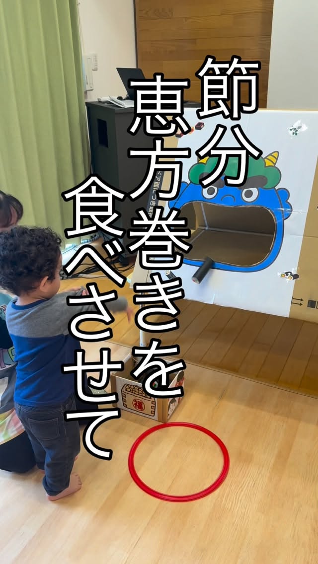 入るかな!?👹✨ 節分の活動で、 恵方巻きを鬼の口に入れるゲームを楽しみました! 段ボールを使って、 手作りの鬼パネルを制作👹 大きな口をめがけて、えいっ! 「入った!」「もう一回!」と、 夢中になって何度もチャレンジする子どもたち😊 狙って投げる動きや、 順番を守る姿、 お友だちを応援する姿も見られました✨ 遊びの中で、 体の使い方やルールも自然と身についています🌱 季節の行事を楽しみながら、 子どもたちの“できた!”を大切にしています。 #節分あそび #保育園の活動 #うるま市保育園 #沖縄子育て #子どもの成長